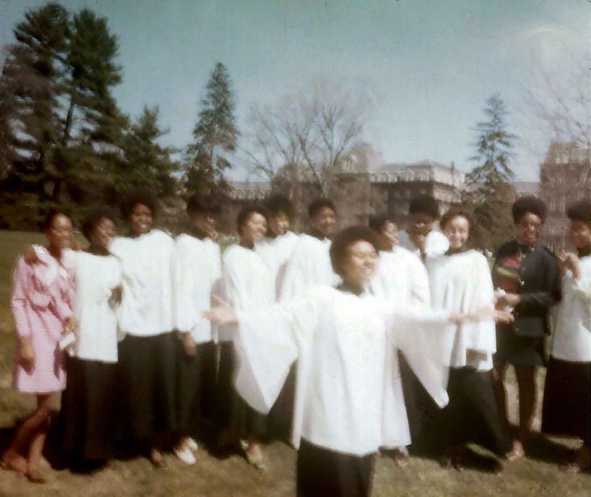 Also, during my freshman year, my classmate Karen League ’72 formed and directed our Gospel Choir. The Black church experience was absent on the Vassar campus, but the choir allowed us to spiritually fellowship together via songs. The regular Chapel congregation was not familiar with our music and very few clapped along with us whenever we marched down the center aisle singing, “Oh, Let Us Walk.” Nonetheless, we were respectfully received. We sang from the choir loft in robes supplied by the Chapel. I’m sure my classmate and Vassar musician LaFleur Paysour ’72 played an integral role in getting us on the Chapel calendar.