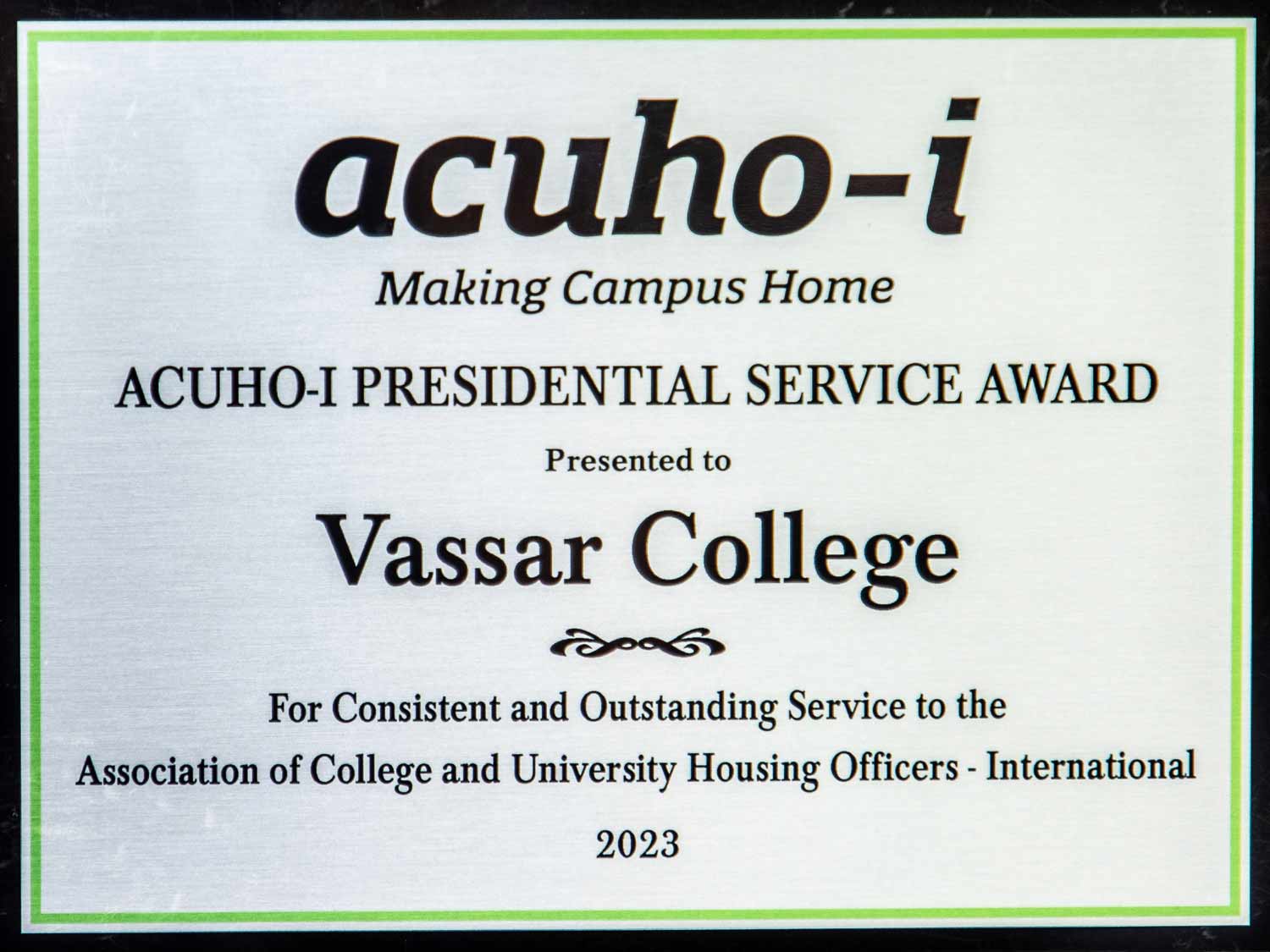 For the second year in a row, Vassar has been recognized by the Association of College and University Housing Officers–International (ACUHO-I) for outstanding contributions to the organization and the profession. Current ACUHO-I President Leon McClinton presented the President’s Service Award to the College at the organization’s annual convention on June 27 in Portland, OR.