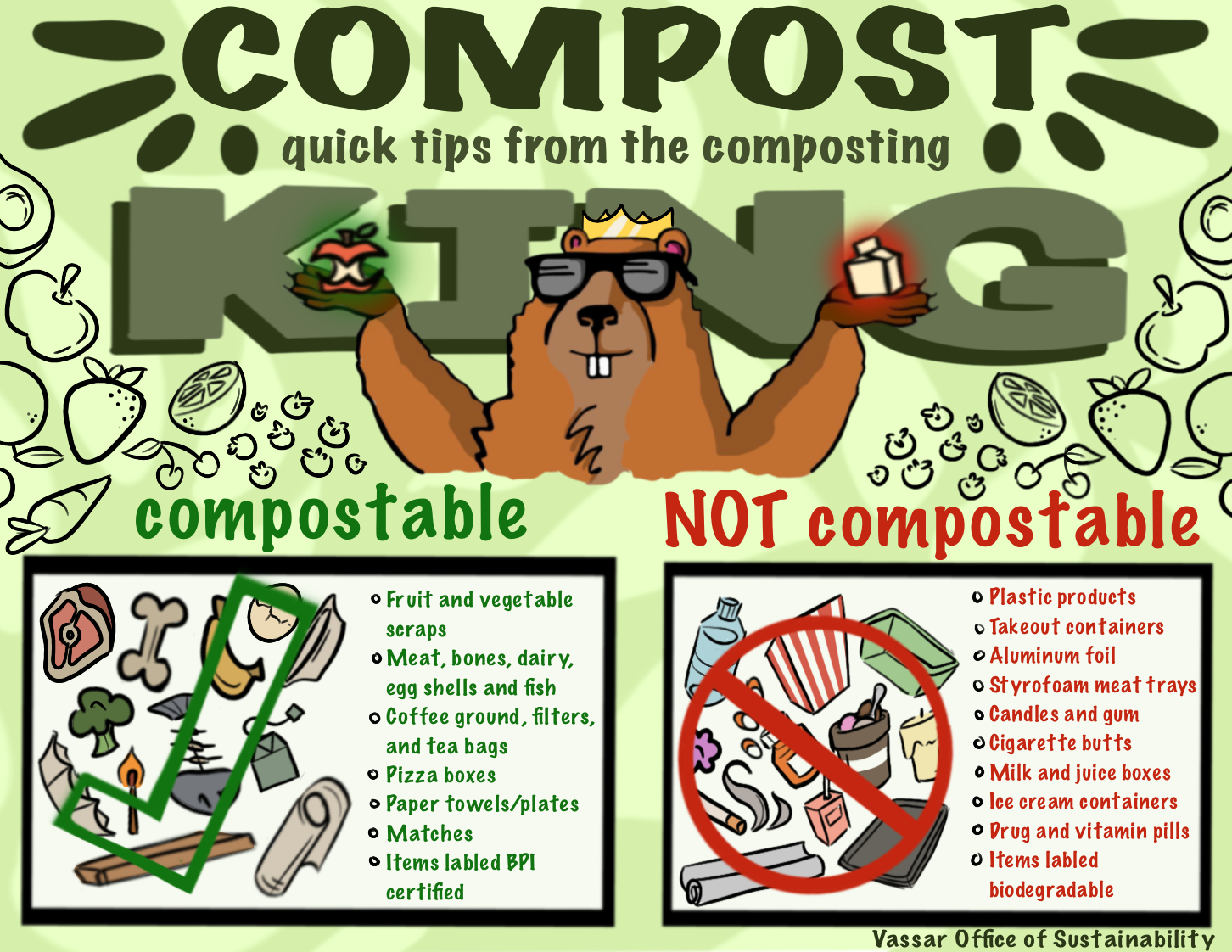 Vassar Dining works with Bon Appetit to minimize food waste. Back of the house, the Waste Not Program reduces waste; any unusable organic waste is collected for composting. Food waste is also collected at the three senior housing complexes. Download and print our composting at Vassar info sheet (PNG) and composting tips sign (PNG). Vassar’s food waste goes to Greenway, a New York State registered compost facility in Clintondale NY that turns organic waste into compost and high quality blended soils.